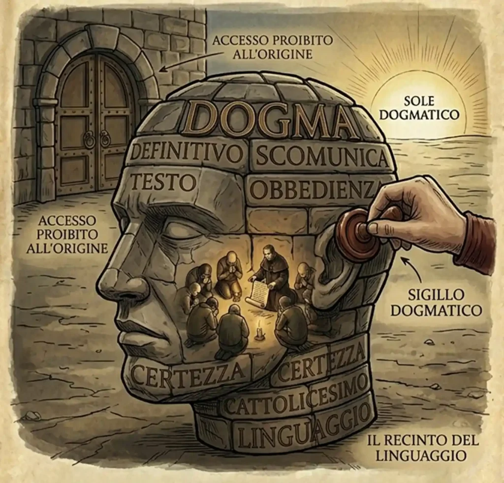 Questa istanza cattolica, per quanto spesso pronunciata con buoni intenzioni, è invero un’operazione di “marketing intellettuale”. Cioè, serve a fornire al fedele l’illusione di essere un individuo libero e pensante, rendendo il cattolicesimo apparentemente compatibile con la modernità o la razionalità. Ma è una porta che si apre solo verso l’interno. Nel momento in cui la ragione scavalca il perimetro del dogma e interroga l‘Origine con onestà, il sistema reagisce con la violenza del linguaggio dogmatico. L’esclusione dai gruppi di appartenenza cattolica o, nei casi estremi, la scomunica, formale o sociale, non scatta per mancanza di logica ma per eccesso di verità. La gerarchia è la prima a tradire la ragione non appena questa smette di essere un’ancella del potere consolidato per mezzo del dogma.